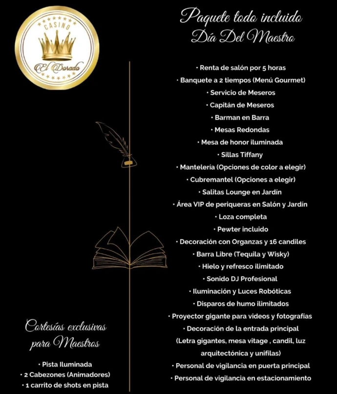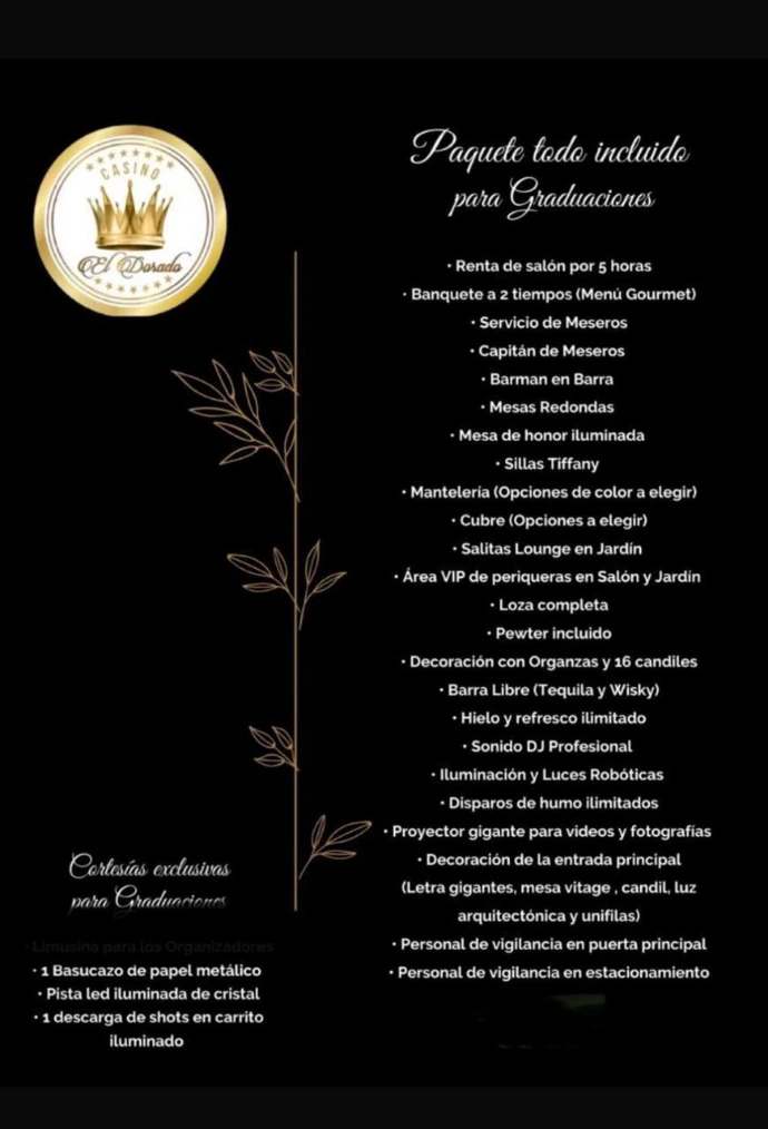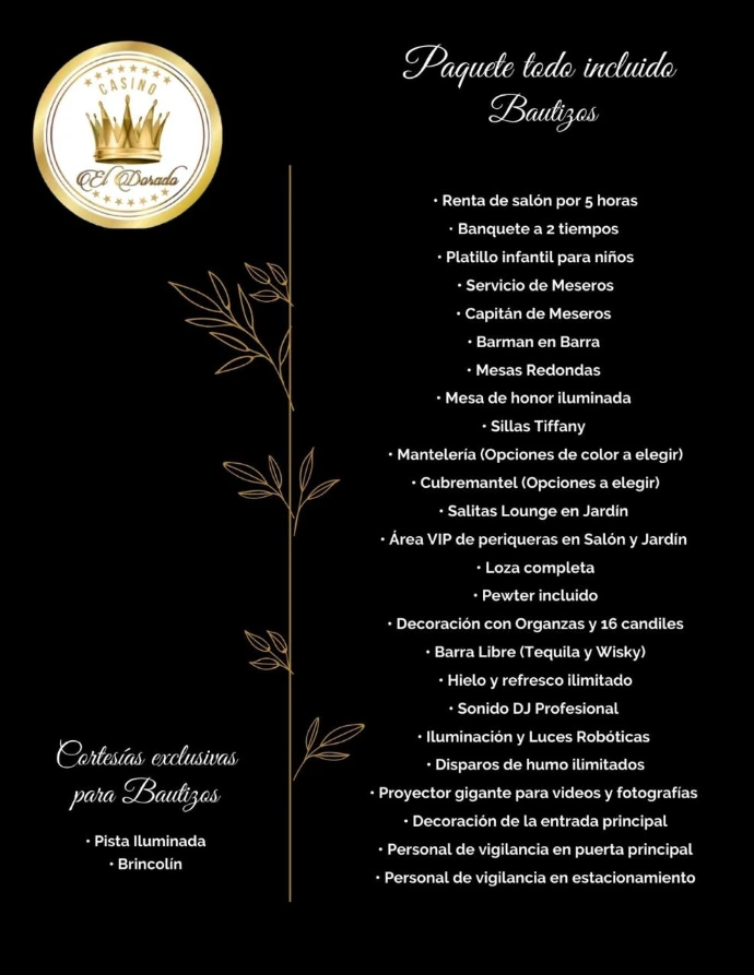 En Casino El Dorado creamos el escenario ideal para eventos que realmente destacan. Nuestra experiencia en bodas, XV años y celebraciones sociales nos permite ofrecer un servicio profesional, espacios elegantes y una atención cercana en cada detalle. Nos enfocamos en que todo fluya perfectamente, anticipándonos a cualquier necesidad para que Tú solo te concentres en disfrutar un momento inolvidable con tus invitados.